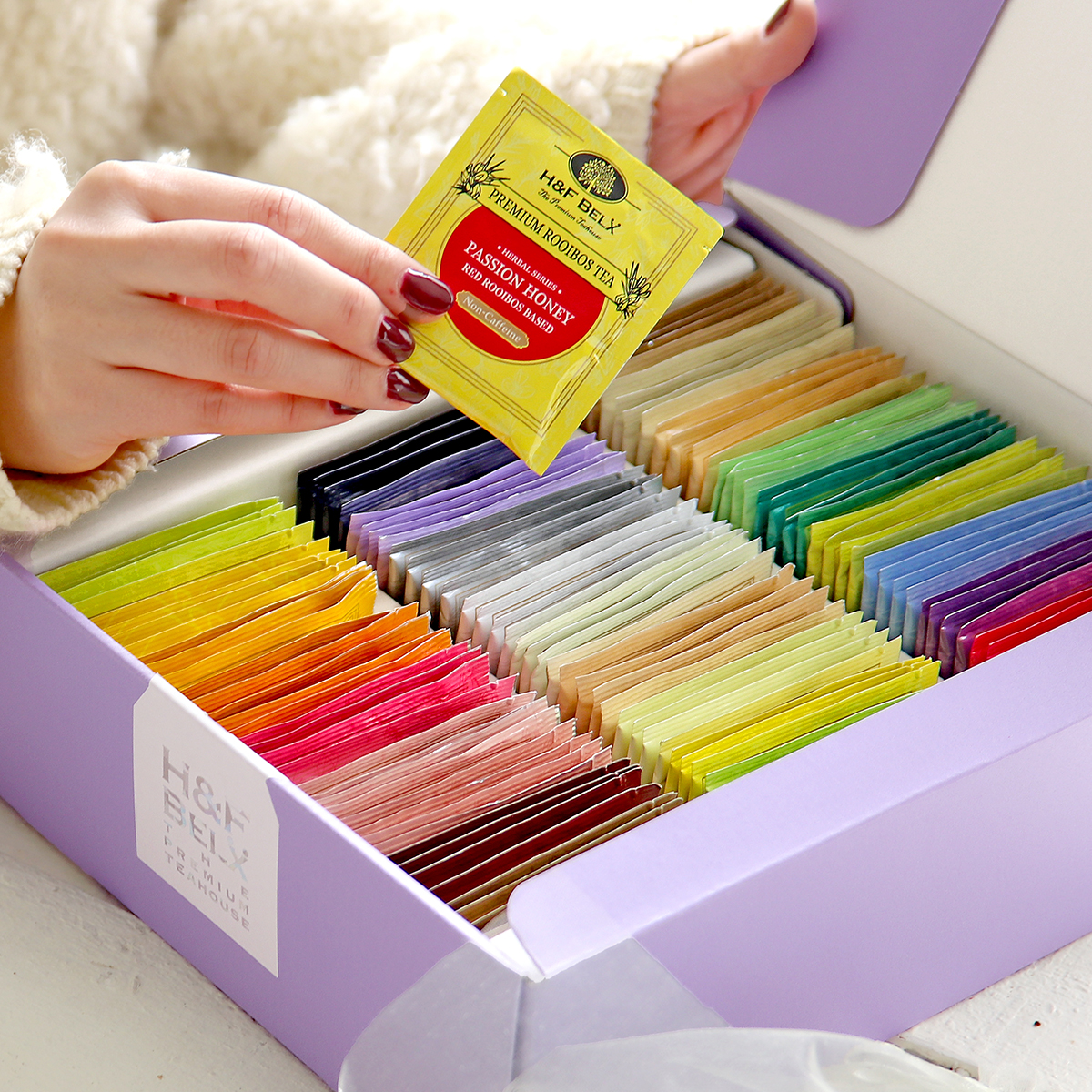 人気のはちみつシリーズに、不動の人気商品パッションハニーも入ったスペシャルなアソートセット。 26種類のルイボスティーをたっぷり詰め合わせました。ベーシック・穀物・フレーバーなど、毎日違う味を楽しめます。 タグ付き個包装ティーバッグで香りを逃さずいつでも新鮮。 カフェインレスで寝る前にも安心して飲めます。