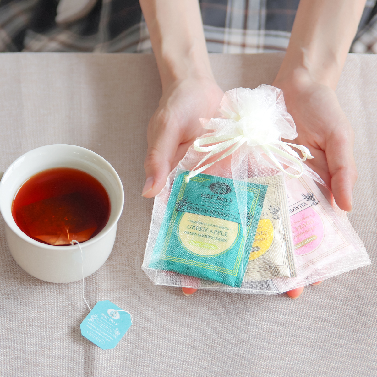 カラフルなティーバッグはギフトやシェアに大活躍! お友達や家族と分けても楽しく、自分へのご褒美としてもおすすめです。 ご自宅や職場など、どんなシーンでも楽しめます。