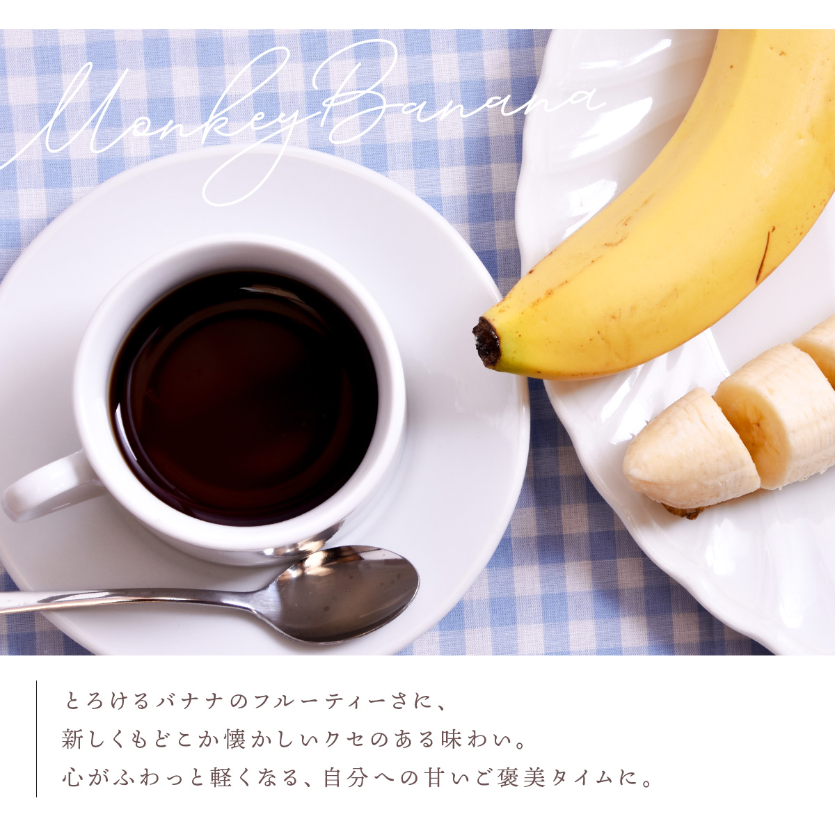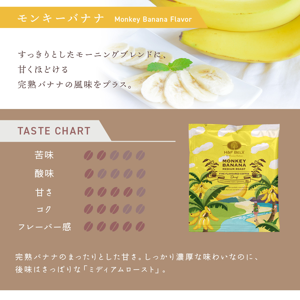 カフェインレスで楽しむ、甘く芳醇なバナナの香り 完熟バナナのような濃厚な香りが広がる、デカフェのフレーバーコーヒー。 「モンキーバナナ」は、カフェインを気にせず楽しめるやさしい甘さの一杯です。 開封した瞬間からふわっと広がるバナナの香り。 口に含むと、まるで完熟バナナのような自然な甘みとやわらかな風味が広がります。 ■ カフェインレスでいつでも楽しめる カフェインを控えたい方にも安心のデカフェコーヒー。 時間を問わず、リラックスタイムや気分転換にお楽しみいただけます。 ■ 濃厚で甘いバナナの香り 袋を開けた瞬間から広がる、完熟バナナのような芳醇な香り。 甘い香りに包まれながら、リラックスしたひとときをお楽しみいただけます。 ■専任焙煎士によるこだわりの一杯 デカフェ豆の特性を見極め、最適な焙煎で引き出された豊かな風味。 雑味の少ないクリアな味わいを実現しています。 ■ やさしく飲みやすい味わい しっかりとしたバナナの風味がありながら、重すぎず軽やかな口当たり。 甘みが際立つ、やさしく飲みやすいフレーバーコーヒーです。 【こんな方におすすめ】 ・カフェインが苦手だけどコーヒーが好きな方 ・甘い香りのフレーバーコーヒーが好きな方 ・健康を気遣う方 ・リラックスタイムを大切にしたい方