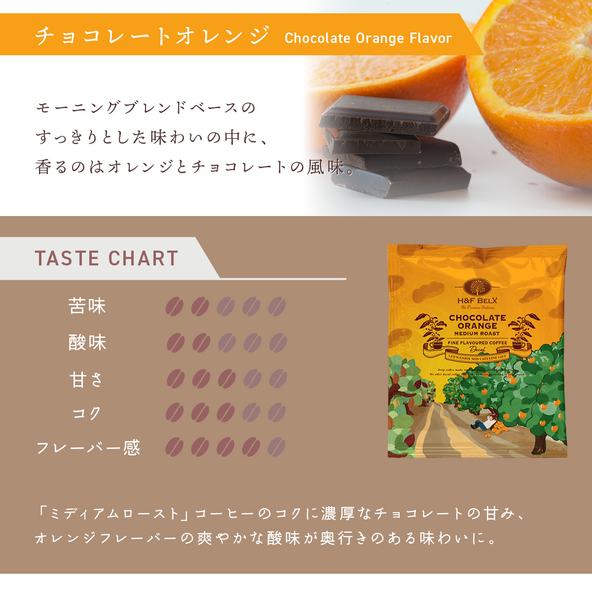 チョコレート×オレンジの絶妙なバランス チョコレートとオレンジが織りなす、贅沢な味わいのデカフェコーヒー。 「チョコレートオレンジ」は、香り・コク・爽やかさが絶妙に調和したフレーバーコーヒーです。 口に含んだ瞬間、オレンジの爽やかな風味がふわっと広がり、 同時にチョコレートのコクが重なり合う、満足感のある一杯に仕上げました。 ■ カフェインレスでいつでも楽しめる カフェインを控えたい方にも安心のデカフェコーヒー。 時間を問わず、リラックスタイムや気分転換にお楽しみいただけます。 ■ チョコレートとオレンジの華やかで奥深いフレーバー 爽やかなオレンジの風味と、コクのあるチョコレートの味わいが調和。 香りからもしっかり“オレンジチョコ”を感じられる、満足度の高いフレーバーです。 ■専任焙煎士によるこだわりの一杯 デカフェ豆の特性を見極め、最適な焙煎で引き出された豊かな風味。 雑味の少ないクリアな味わいを実現しています。 ■ 個性的なのに飲みやすい味わい フレーバーコーヒーならではの個性がありながら、後味はすっきり。 くどさがなく、毎日でも楽しみやすい仕上がりです。 【こんな方におすすめ】 ・カフェインが苦手だけどコーヒーが好きな方 ・個性的なフレーバーコーヒーが好きな方 ・健康を気遣う方 ・甘さと爽やかさのバランスを楽しみたい方